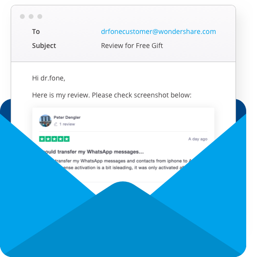 Send email with subject "Review for Free Gift" to drfonecustomer@wondershare.com including the review screenshots once you posted the review of dr.fone.